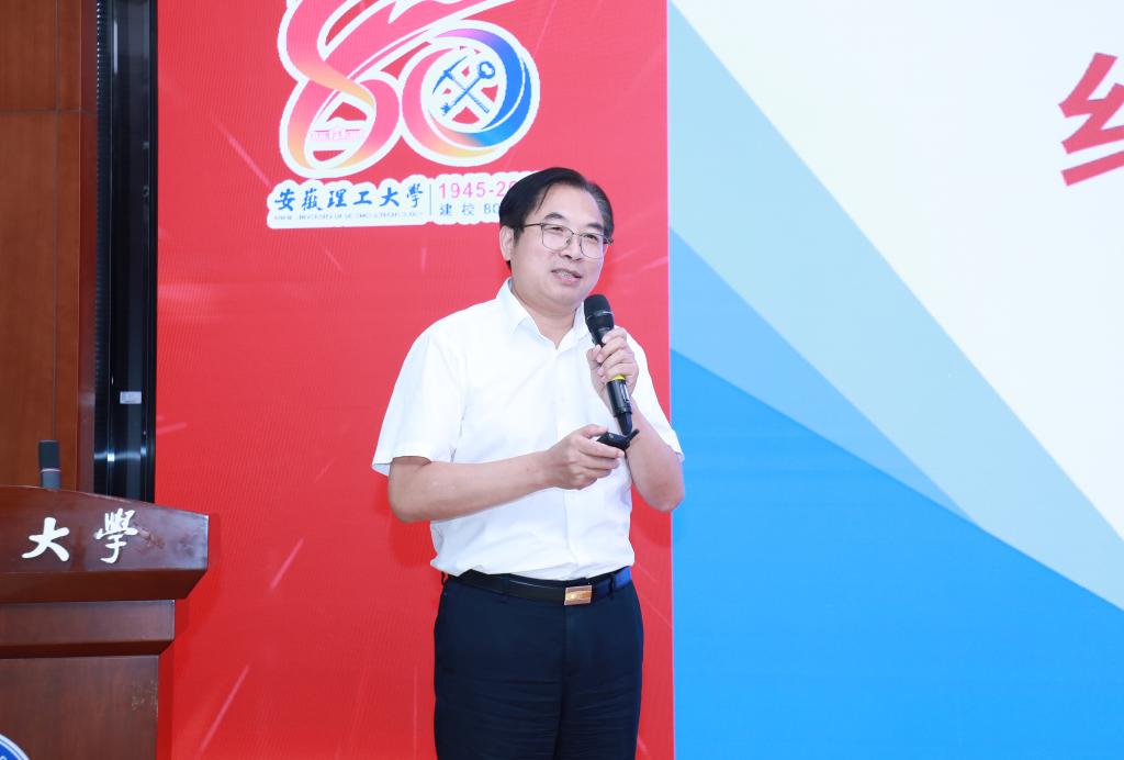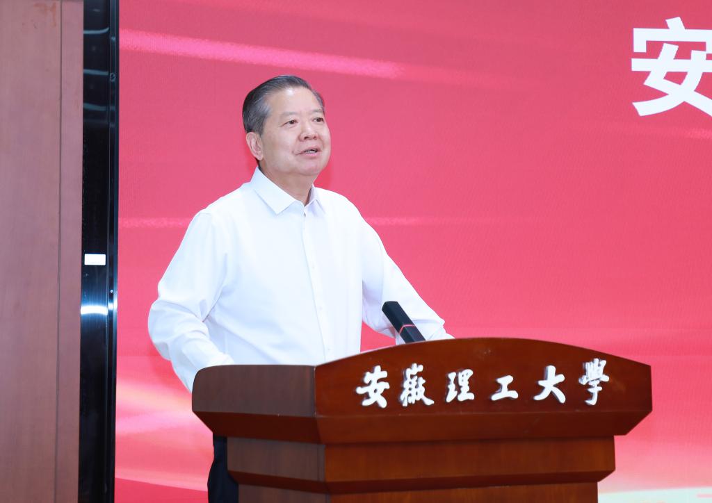 朱庆龙致辞。他表示,恒大江海与安徽理工大学合肥校区仅一路之隔,“地缘近邻”的优势为校企合作提供了天然便利,设立“恒大江海奖学金”,旨在助力学校高层次人才队伍建设,同时以实际行动推动校企协同发展,共同打造校企协同创新“安徽样板”。他强调,恒大江海愿与安徽理工大学深化合作,在科学研究上“同频共振”,在人才培养上“同向发力”,在服务国家战略上“同心致远”,携手为国家矿山安全保障、能源安全供应及高素质人才培育贡献更大力量。