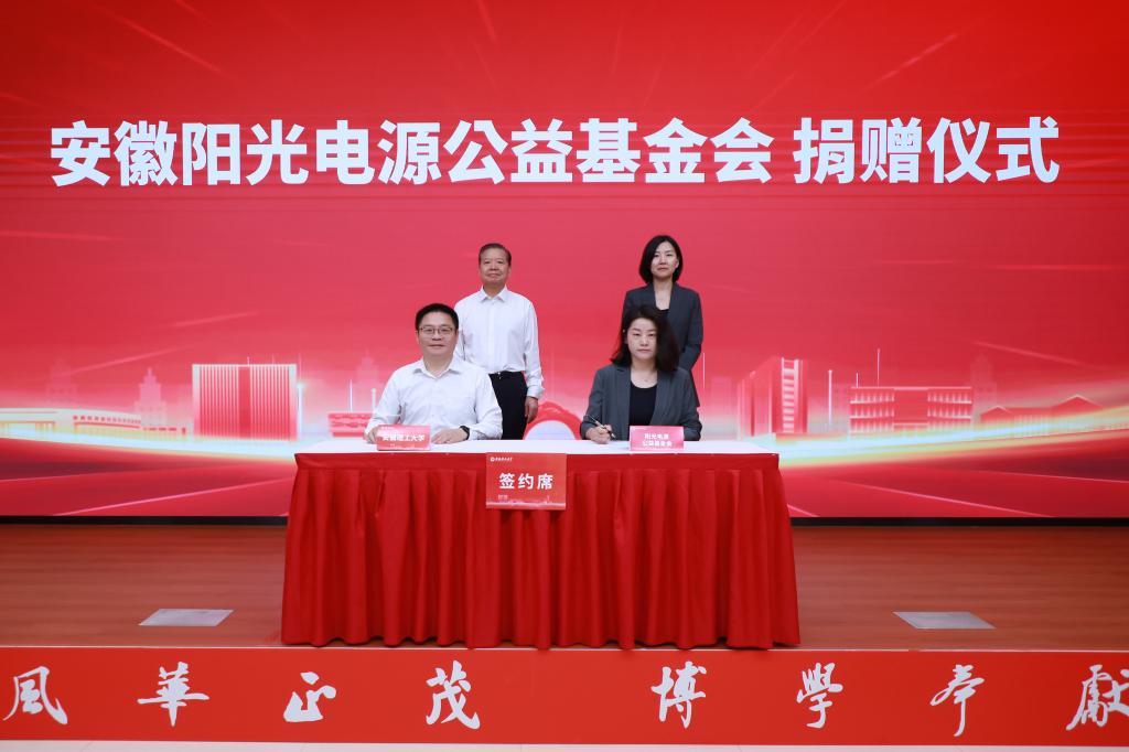 在袁亮、安徽阳光电源公益基金会理事长李秋宜共同见证下,余玉刚与安徽阳光电源公益基金会秘书长金蓓签订捐赠协议。
