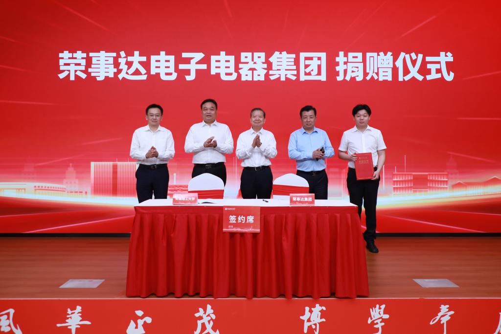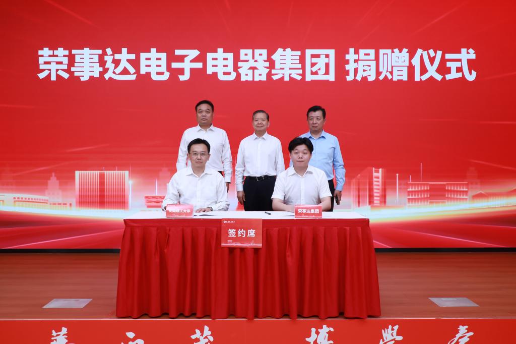 在袁亮、荣事达电子电器集团董事局主席潘保春、副总裁张会军共同见证下,赵光明与荣事达电子电器集团荣品科技住宅公司董事长潘寅签订捐赠协议。