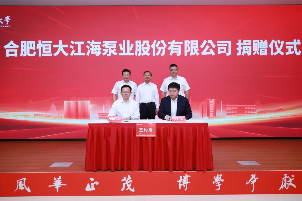 在袁亮、合肥恒大江海泵业股份有限公司常务副总经理汪冰共同见证下,赵光明与合肥恒大江海泵业股份有限公司董事长助理朱天翔签订捐赠协议。
