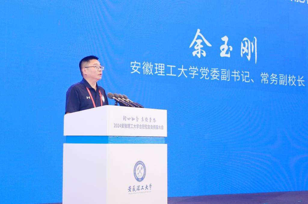 余玉刚致辞,他对大会的召开表示热烈祝贺,对合肥校友们卓有成效的工作和对母校发展给予的大力支持和关心表示由衷感谢!余玉刚表示,学校办学79年来,为国家培养各类优秀人才34万余名,包括5位中国工程院院士及一大批学术精英、政界贤达、企业翘楚,为国家为安徽能源工业科技进步、高质量发展提供了有力的人才和智力支撑。学校第七次党代会提出创建“世界一流学科和国内一流特色高水平大学”的奋斗目标以来,自信自强迈入内涵式发展“快车道”,发生了深层次格局性变化。饮水思源,收获怀耕,校友是学校办学成果的根本体现,母校与校友始终是休戚相关的发展共同体。希望合肥校友会新一届理事会坚持以服务校友为宗旨、以服务社会为使命、以服务母校为责任,不断凝聚合肥校友的聪明才智,不断密切母校校友的沟通联系,不断健全组织体系、创新工作方法,切实为校友、社会和母校的发展做出更大的贡献!余玉刚邀请广大校友在母校办学80周年华诞之际,相聚舜耕山下、重回母校怀抱,共叙成长,共谋发展,共同续写安徽理工大学高质量发展的辉煌新篇章!