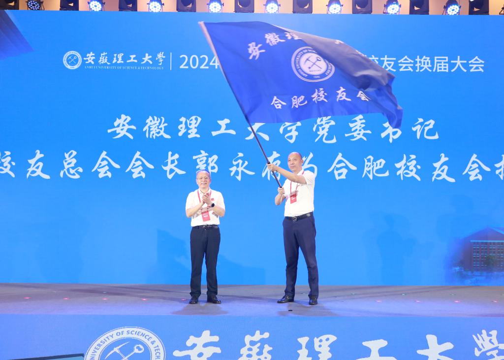 郭永存为新一届合肥校友会授旗、授牌,余玉刚为新一届合肥校友会理事会成员颁发聘书。