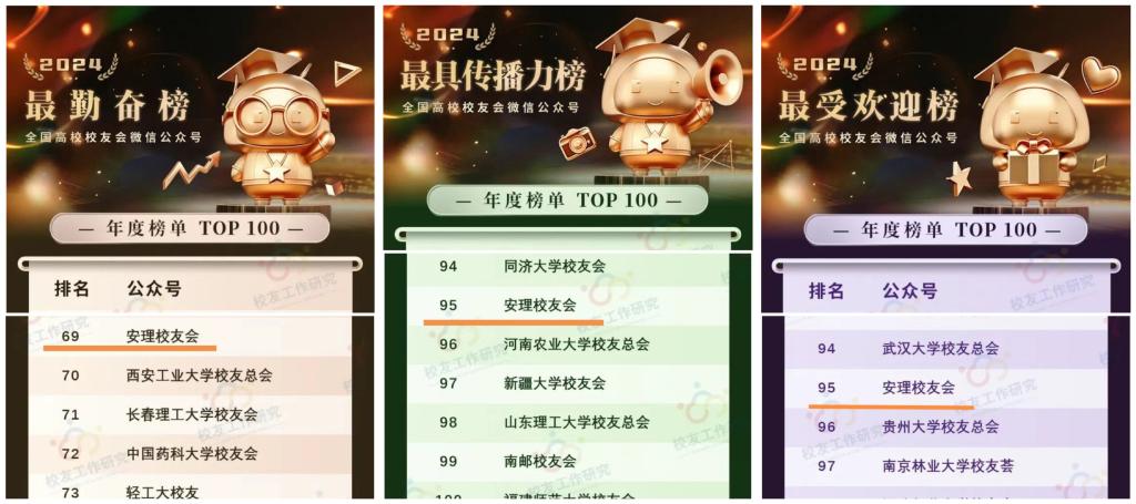 “校友会公众号排行榜”基于“校友工作研究”历时九年多收集的高校校友会公众号样本库产生,目前样本库中共有500+个高校校友会公众号。排行榜综合全年公众号的文章阅读总量、点赞总量、发文总量等关键指标,采用蓝矩指数计算公式进行综合运算与排名,数值越大,排名越靠前。我校校友总会微信公众号“安理校友会”凭借出色的运营表现和广泛的影响力,在多个榜单中成绩斐然,在“最勤奋榜”位列第69,“最具传播力榜”位列第95,“最受欢迎榜”位列第95。