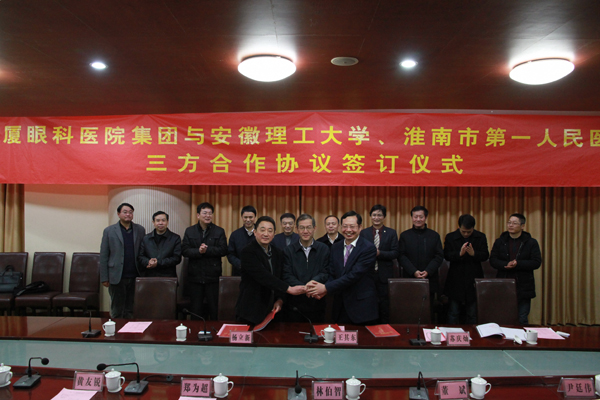 2月21日下午,我校与华厦眼科医院集团、淮南市第一人民医院三方合作协议签字仪式在淮南新锦江宾馆第2会议室举行?;醚劭埔皆杭哦鲁に涨觳?,淮南市第一人民医院党委书记、院长杨立新,校党委书记郭永存教授、校长王其东教授出席签字仪式。仪式由第一临床医学院名誉院长、市政协副主席、市卫生与计划生育委员会主任方严主持。